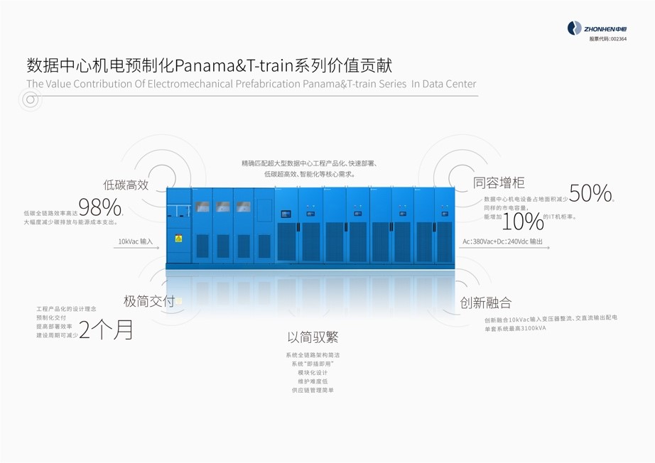 發展新能源和研制新型的能源供電架構是推動節能減排、低碳發展的重要路徑。Panama&T-train是中恒通過創新的磁路技術、電力電子技術和數字化技術,研制出的融合10KV配電、新型變壓器、不間斷電源(HVDC)和智能輸配電等單元的智能一體化電源系統。