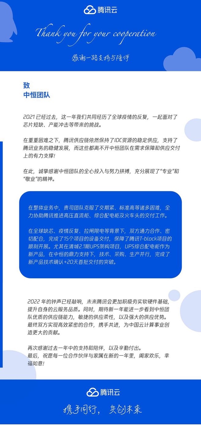 日前,我司收到了來自騰訊云的感謝信,信中騰訊云對我司2021年在騰訊云供應鏈上的全心投入、努力拼搏以及“專業”又“敬業”的精神,給予了特別的贊美和由衷的感謝。