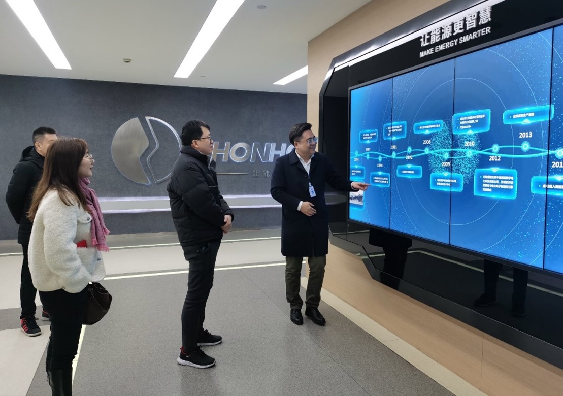 在胥總的帶領下,曾東城處長參觀了公司展廳,詳細了解了公司的發展歷程,著重聽取了公司在綠色ICT基礎設施、低碳交通、新型電力系統和綜合能源服務等領域的技術產品布局,對公司積極探索新能源、新技術、新業態的發展模式表示贊賞。
