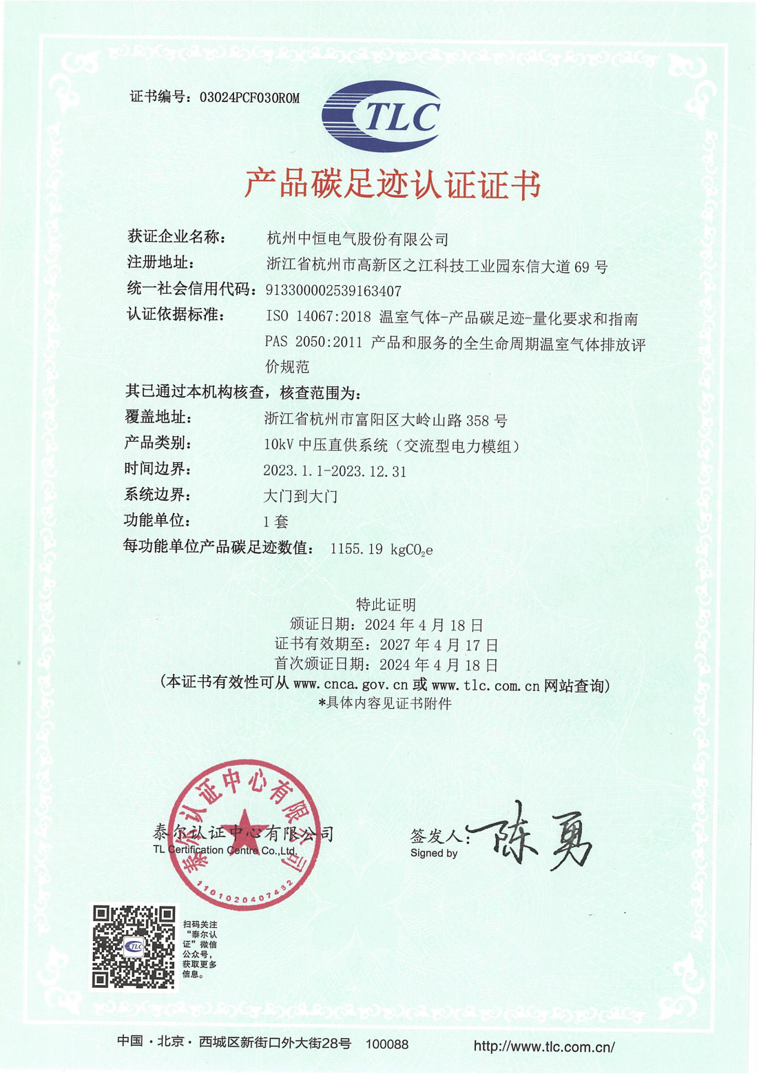【公示】產(chǎn)品碳足跡認證證書-交流型電力模組