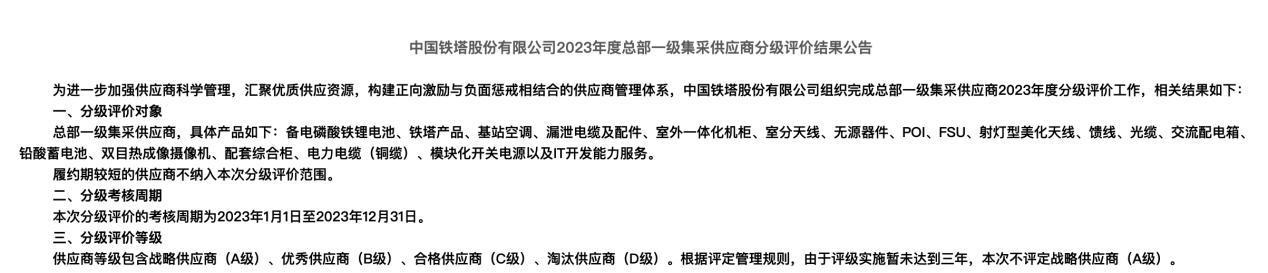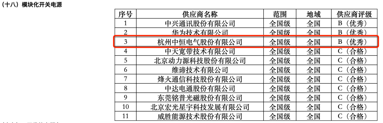 近日,中國(guó)鐵塔公布了2023年度總部一級(jí)集采供應(yīng)商分級(jí)評(píng)價(jià)結(jié)果,中恒電氣的“模塊化開(kāi)關(guān)電源”產(chǎn)品榮獲優(yōu)秀供應(yīng)商(B)評(píng)級(jí)。