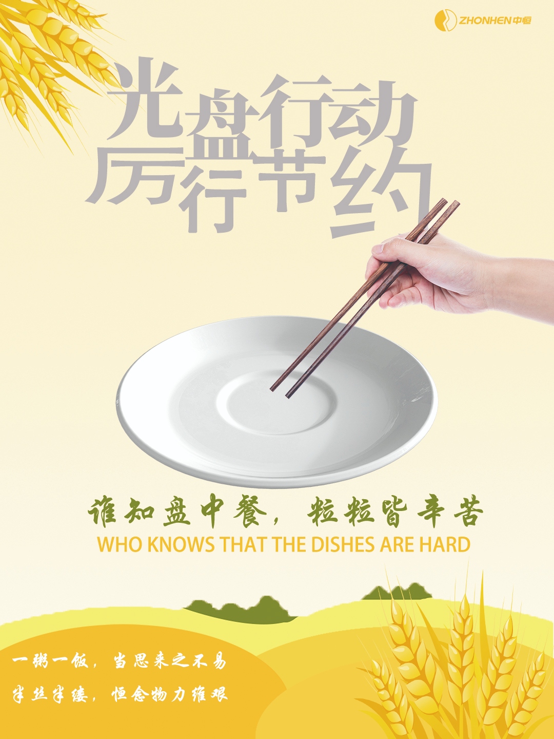 當前,餐桌上浪費的糧食數量巨大,剩菜剩飯觸目驚心,在我們的身邊,對糧食的浪費比比皆是。各個餐館、食堂,每天都要倒掉大量的剩飯剩菜。俗話說 “誰知盤中餐,粒粒皆辛苦”?!吧嗉馍系睦速M”觸目驚心,身邊的浪費比比皆是。我國每年浪費食物總量折合糧食約500億公斤,接近全國糧食總產量的十分之一,最少倒掉了約2億人一年的口糧。為了進 一步弘揚中華民族勤儉節約的美德,大家一起來向“舌尖上的浪費”說“no”。為此,請全體中恒人積極響應“光盤行動”倡議。