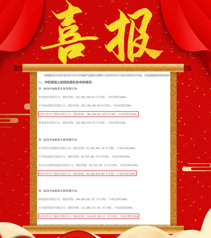 2020年9月15日,中恒電氣分立式開關(guān)電源、壁掛式開關(guān)電源、嵌入式開關(guān)電源均獲選中國移動2020年至2021年開關(guān)電源產(chǎn)品集中采購項目中標(biāo)候選人,并取得較大份額。此次預(yù)中標(biāo),是繼5G-PAD電源、組合式開關(guān)電源、直流遠(yuǎn)供電源大份額中標(biāo)運營商集采項目后,其他系列網(wǎng)絡(luò)能源產(chǎn)品再次中標(biāo)運營商集采項目,意味著中恒全系列通信電源產(chǎn)品及5G電源整體解決方案得到行業(yè)高度認(rèn)可和信任,并將為5G網(wǎng)絡(luò)能源基礎(chǔ)設(shè)施建設(shè)奠定良好基礎(chǔ),同時,更進(jìn)一步加深了公司與運營商的合作!